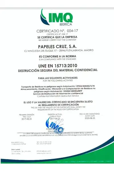Rellena el formulario o llámanos y nos encargamos de acompañarte en todo el proceso para que la gestión de tus residuos y documentación se realice con la máxima garantía, experiencia y confianza. La web destaca su experiencia en la Comunidad de Madrid desde los años 80 y sus servicios de destrucción documental, recuperación de papel y cartón, y gestión de residuos no peligrosos.